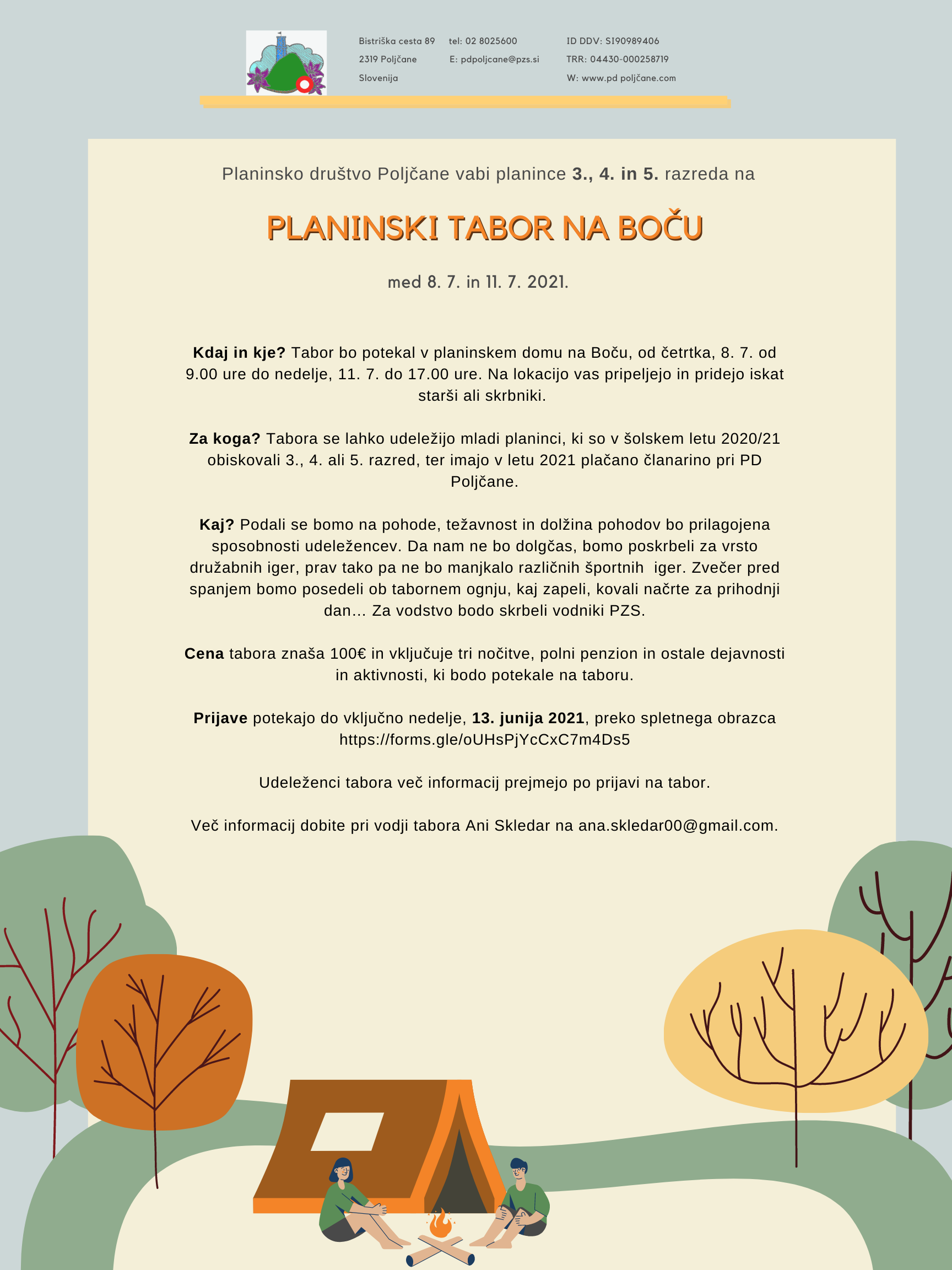 Planince 3., 4. in 5. razreda vabimo na Planinski tabor na Boču, ki bo potekal med 8. in 11. julijem 2021.