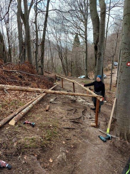 Največ dela so opravili na Strmi poti, ki so jo opremili z ograjami za omejitev bližnjic. Vgradili so 27 m bočnih talnih ograj, 112 m, klasičnih ograj in 12 stopnic. Upamo, da bodo obiskovalci Boča spoštovali njihovo delo – in čuvali naravo – in hodili le po poti, ne vsak po svoji bližnjici. Delali so skoraj ves dan, naš najemnik Oliver pa jih je počastil s kosilom in pijačo.